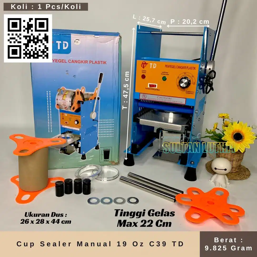 alat untuk menyegel gelas plastik minuman, biasanya digunakan untuk usaha seperti bubble tea, kopi, dan minuman kemasan lainnya. Mesin ini bekerja secara manual, dimana pengguna perlu menggeser tuas atau tatakan untuk menekan dan menyegel gelas dengan plastik