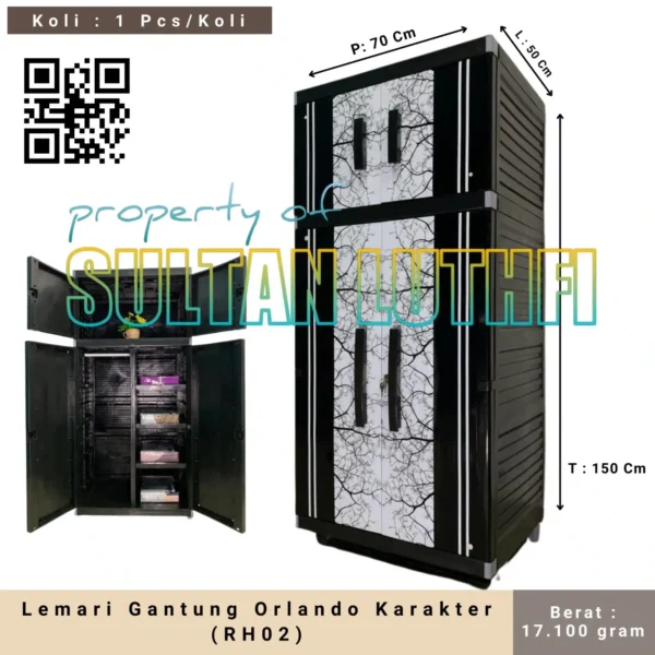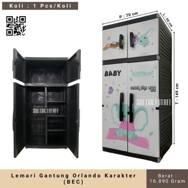 Merupakan lemari dengan design gambar yang menarik. Bagian dalam nya terdiri dari rak rak dan gantungan, pada pimtu bagian atasnya terdapat rak dan 2 pintu dibawah terdapat rak dan gantungan sehingga dapat menyimpan lebih banyak pakaian anda.