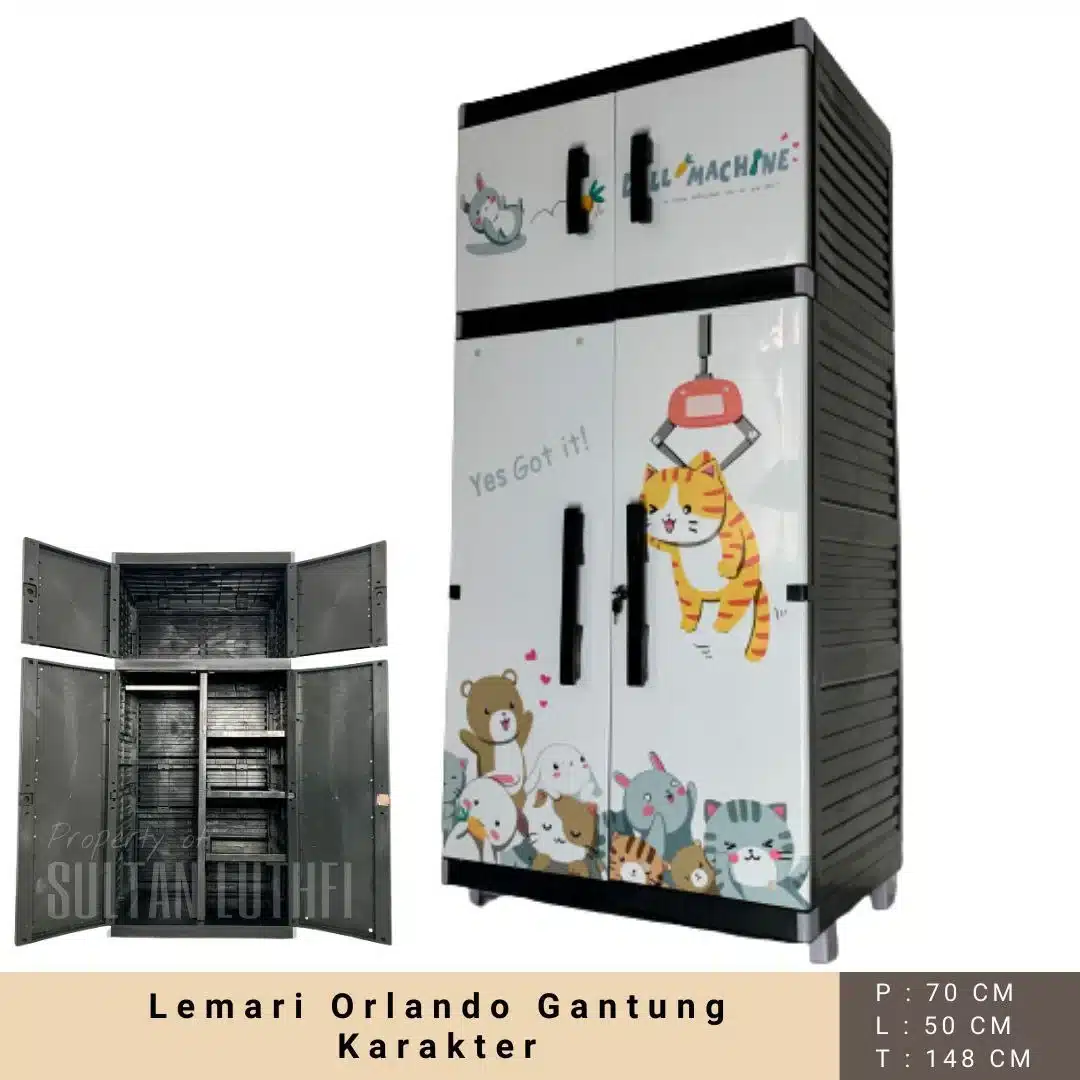 Merupakan lemari dengan design gambar yang menarik. Bagian dalam nya terdiri dari rak rak dan gantungan, pada pimtu bagian atasnya terdapat rak dan 2 pintu dibawah terdapat rak dan gantungan sehingga dapat menyimpan lebih banyak pakaian anda.