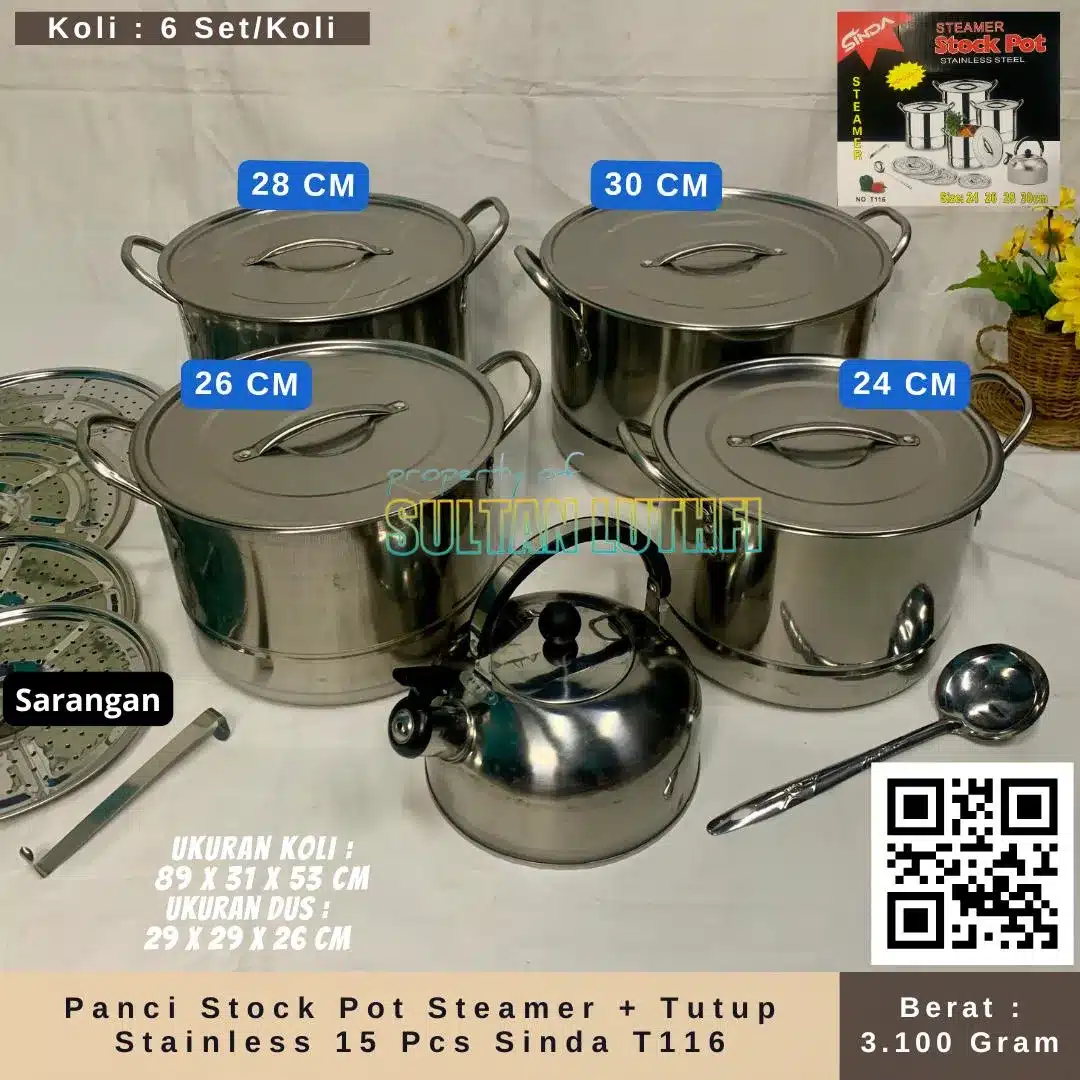Panci Stock Pot Steamer + Tutup Stainless 15 Pcs Sinda T116