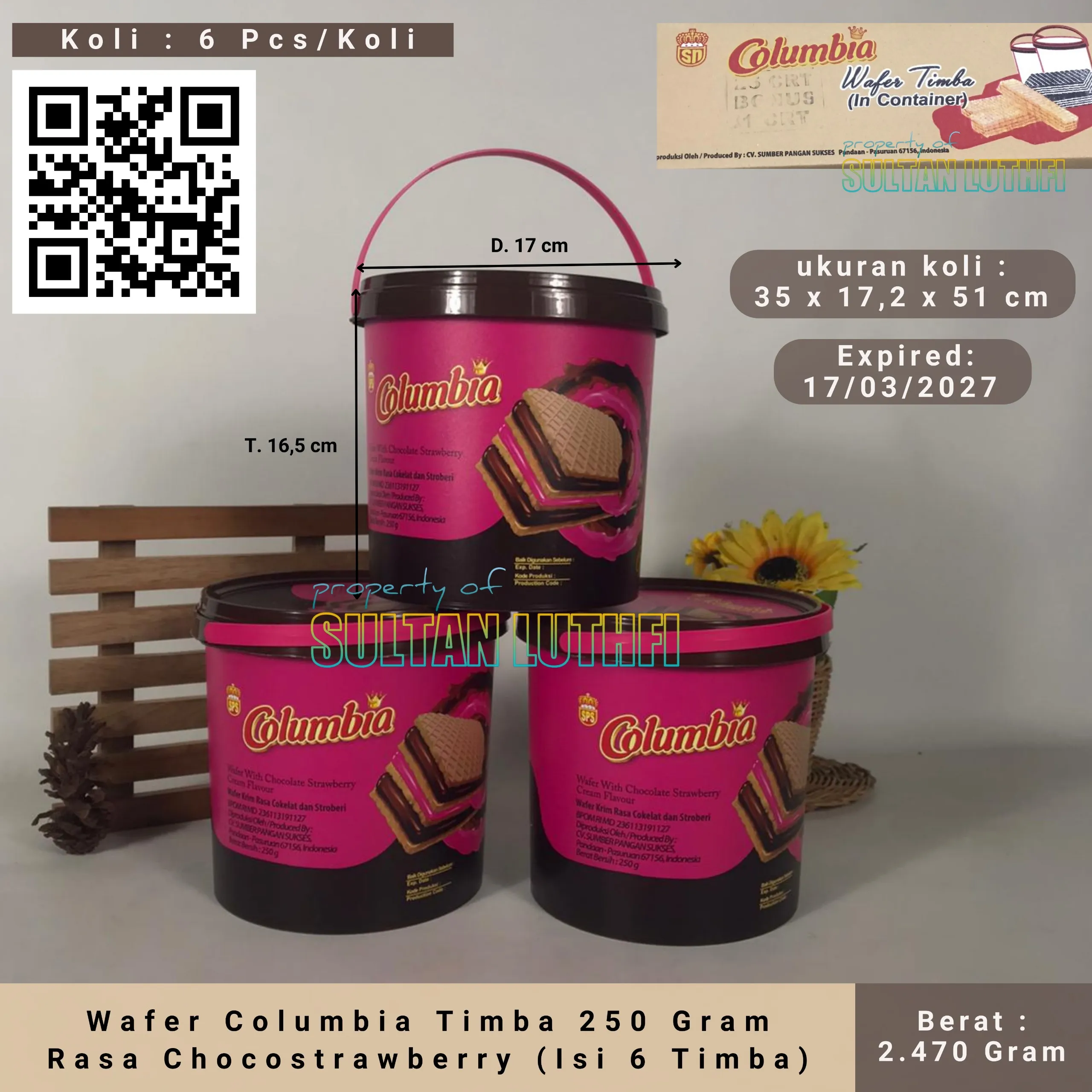Wafer Columbia Timba 250 Gram adalah wafer aneka rasa kemasan kaleng timba yang tersedia dalam berbagai pilihan rasa. Produk ini populer sebagai camilan dan sering dicari terutama saat perayaan seperti Lebaran.